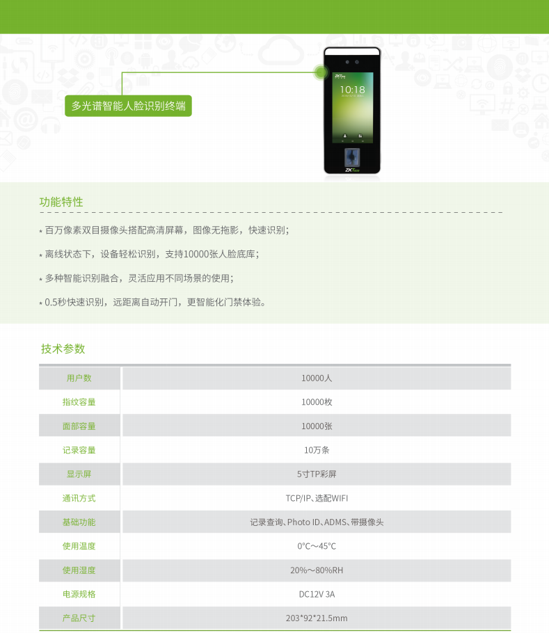 • 產品描述:BioFace系列是ZKTeco熵基科技根據市場需求,全新推出的多光譜智能人臉識別終端,區別于以往的人臉靜態識別,具有快速讀取、動態識別的功能。BioFace具有人臉錄入和人臉識別功能,指紋、人臉等多種驗證方式,簽到多種選擇,輕松考勤;谷歌輸入法,輕松編寫。標配Wiegand in/out,具有門磁、報警等多種功能,守護您工作安全。